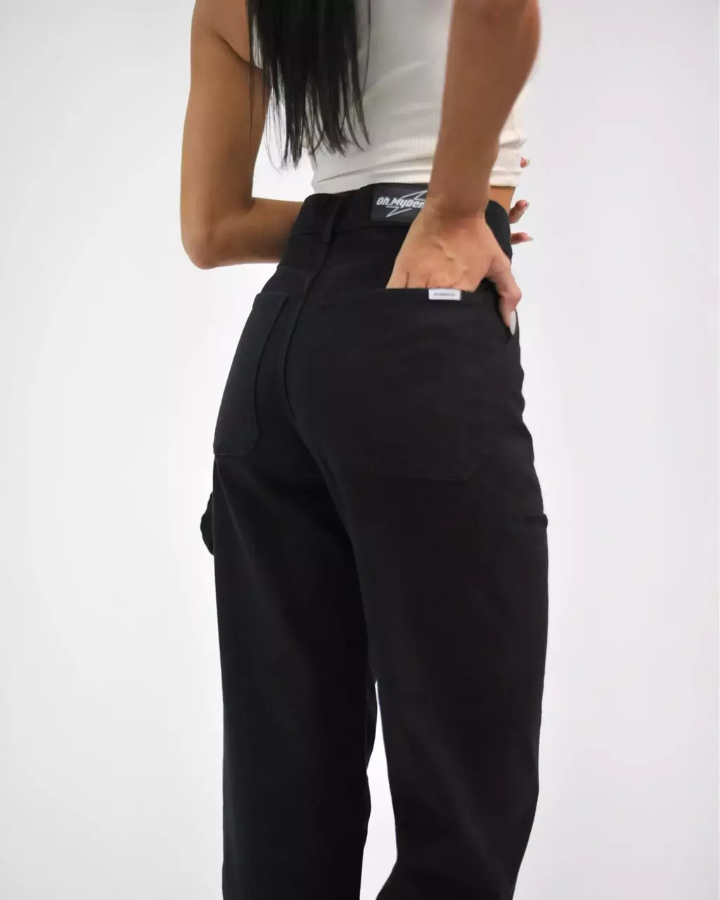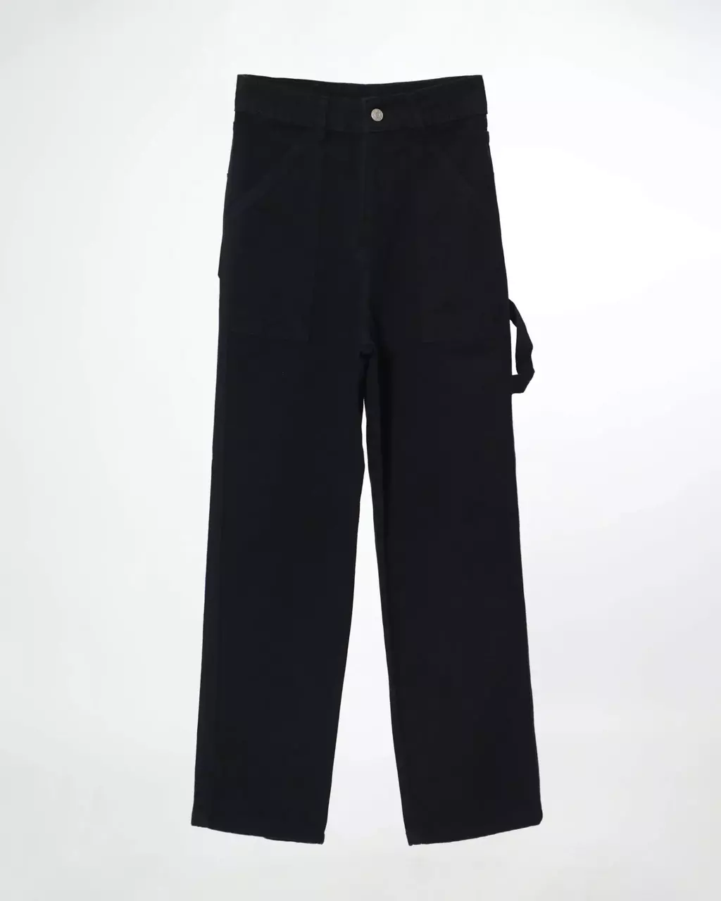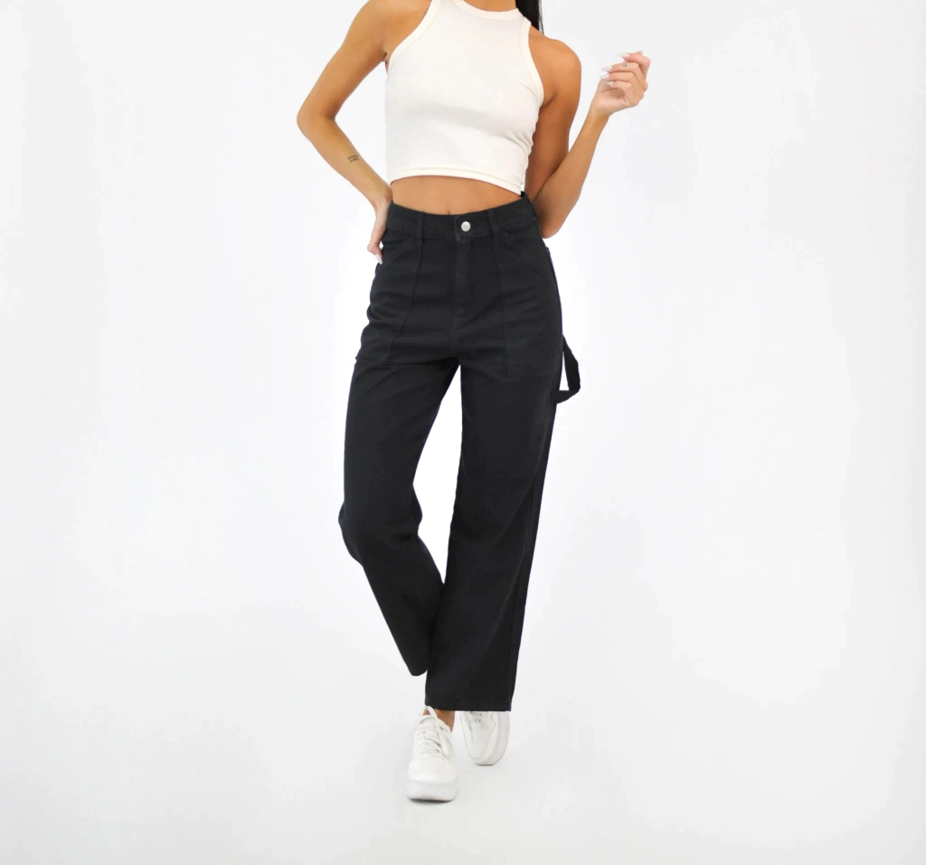 Jean straight recto clasico, con bolsillos y tiras estilo carpintero. Tiro alto.